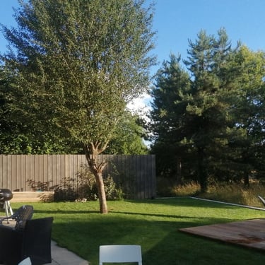 > Se protéger du vis-à-vis par un alignement d'arbres persistants du côté des voisins et installer des jardinières hautes de graminées pour faire office de garde-corps et ainsi conserver la vue dégagée sur le paysage.
