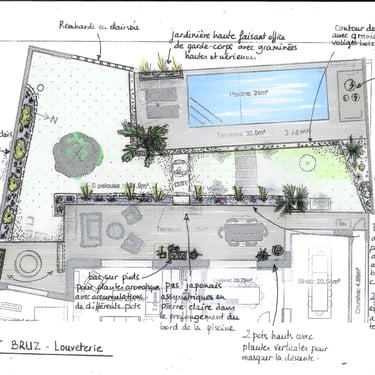 La piscine ainsi que les terrasses bois sont déjà installées et doivent être prises en compte dans le projet final.