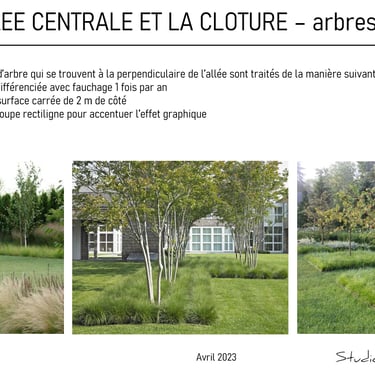 > La conservation des arbres fruitiers implantés en diagonale sur la parcelle était une forte contrainte. Le projet s'est clairement appuyé sur cette contrainte pour en faire un élément fort, graphique et central. Cette diagonale est même soulignée par une tonte différenciée en pied d'arbre : le gazon est volontairement maintenu haut sur un carré de 2mx2m pour exagérer l'aspect graphique du jardin.