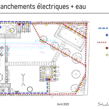 La création d'un espace jacuzzi au centre du jardin demande une extension des réseaux eau et électricité.
