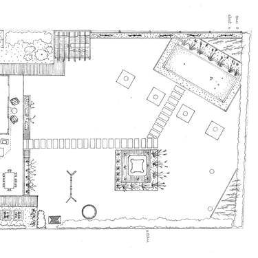 > La répartition des différents espaces s'est faite en fonction de 2 critères : les espaces "enfants" à proximité immédiate de la terrasse (jeux et potager) et les espaces "adultes" dans les zones ensoleillées de fin de journée (pétanque, jacuzzi).