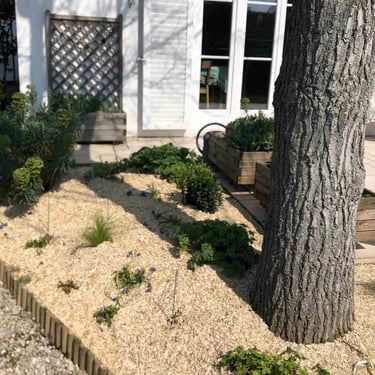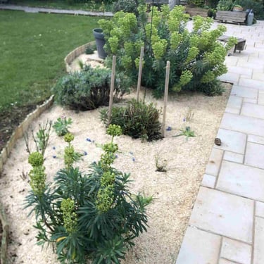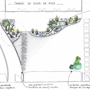 > La maison achetée par le client lui faisait penser à une maison de vacances d'été, le projet s'est donc naturellement orienté vers la création d'un jardin de style "bord de mer". Des massifs aux contours courbes viennent encadrer la terrasse et refermer l'espace autour de la partie centrale pour créer un aspect "cocoon".